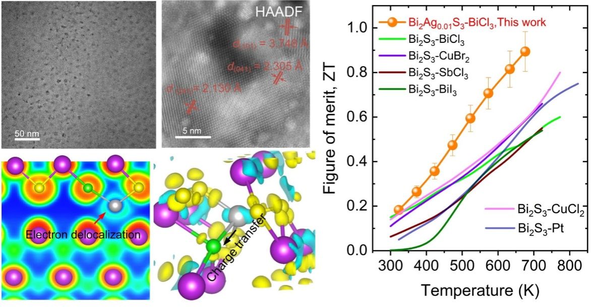In recent years, bismuth sulfide (Bi2S3) has been considered a promising thermoelectric material due to its large Seebeck coefficient, low thermal conductivity, and low environmental friendliness. However, the covalent bond properties of Bi2S3 and the strong Peierls distortion make its carriers strongly localized, resulting in low carrier concentration and small mobility, resulting in poor thermoelectric performance. We found that the introduction of Ag and the introduction of Cl substitution S in the Van der Waals gap of the Bi2S3 material allow the delocalized electrons provided by the embedded silver atoms to transfer the charge to the neighboring Cl atoms through the "bridge", thus increasing the carrier concentration and mobility at the same time. In addition, the high-density small-angle grain boundaries observed in the doped samples also contribute to a significant reduction in the lattice thermal conductivity of the material. Finally, the ZT value of Bi2S3 co-doped with Ag and Cl was 0.9, and the average ZT value was 0.52 at 323–676 K, both of which reached the highest level of Bi2S3-based thermoelectric materials.