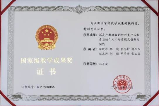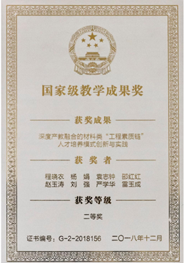 On December 21, 2018, the Ministry of Education's Decision on the Approval of the 2018 National Teaching Achievement Award (Teacher (2018) No. 21) officially announced the list of winning projects. The "Innovation and Practice of Talent Training Model of "Engineering Quality Chain" talent training model of materials integrated by deep production and teaching, led by Professor Cheng Xiaonon, won the second prize of the National Teaching Achievement Award. Recently, they received awards, medals and medals from the Ministry of Education.