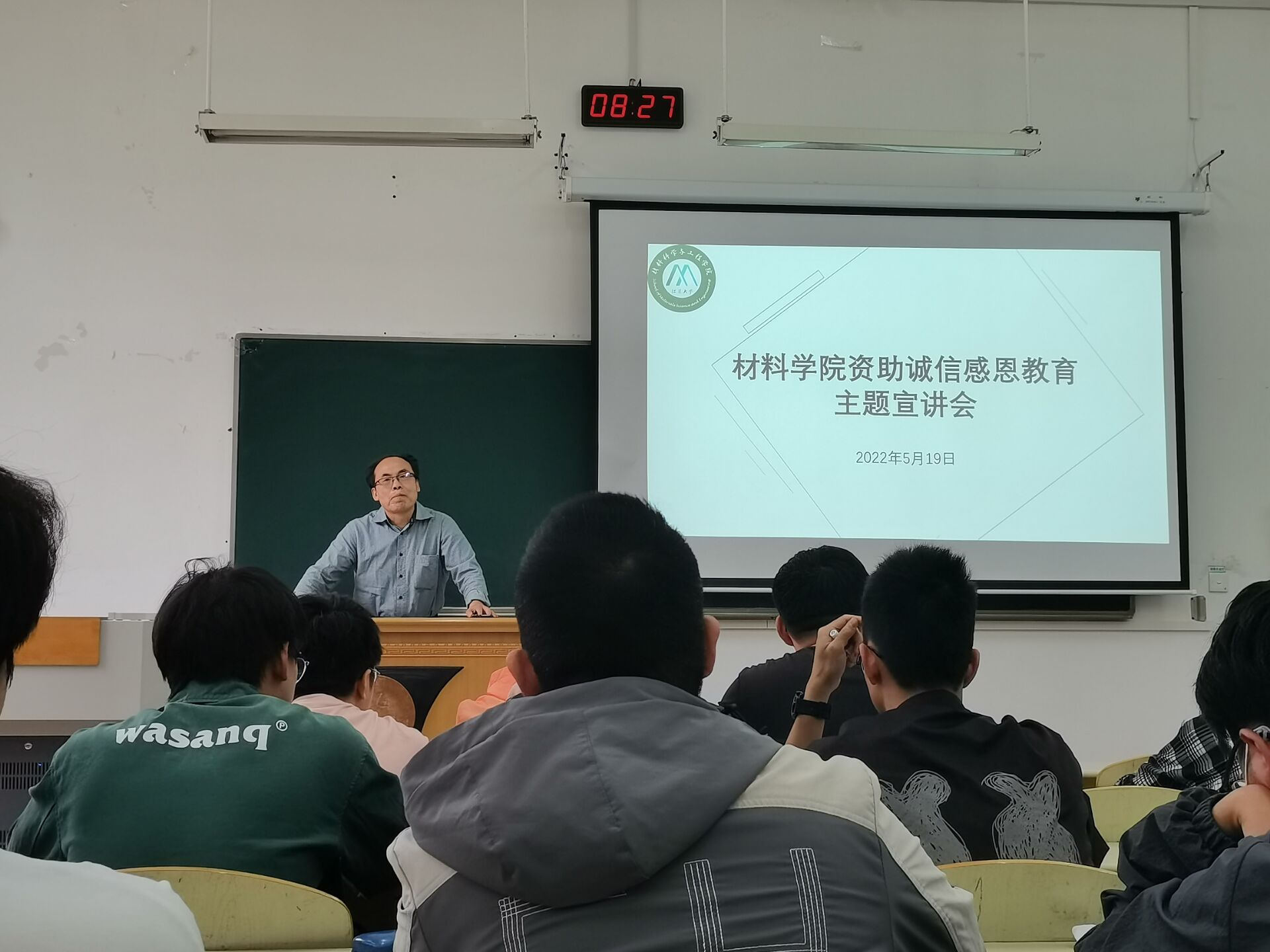 为深入推进资助育人工作,5月19日上午,材料学院组织开展资助诚信教育主题宣讲会。会议由材料学院关工委委员司乃潮老师主讲,辅导员刘涛和成型专业2020级全体本科生参加。
