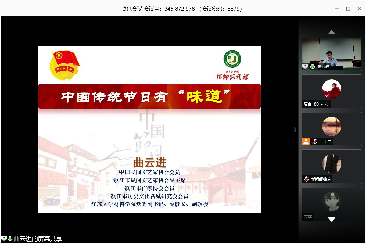 为弘扬中华优秀传统文化,坚定文化自信,2020年5月22日晚19:00,材料学院团委通过腾讯会议平台开展了素养公开课:中国传统节日有“味道”,主讲嘉宾为材料学院关工委副主任、党委副书记,中国民间文艺家协会会员,镇江市民间文艺家协会副主席曲云进副教授,活动由赵钧老师主持,近200位同学参加。