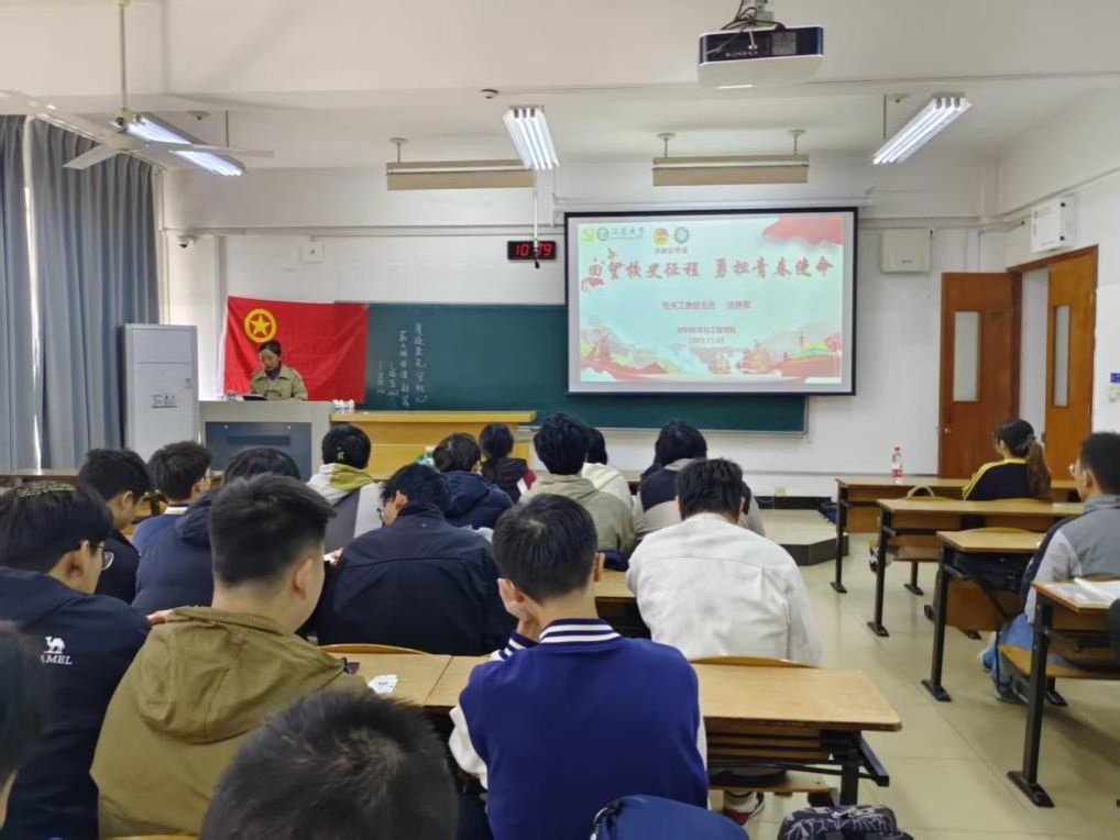 为引导青年学子深入了解yl6809永利校史底蕴,传承学校优良传统,深刻领悟“自强厚德,实干求真”的江大精神,明确新时代青年的责任担当,11月3日10:00,材料学院关工委于三山楼207教室开展“回望校史征程,勇担青春使命”主题讲座。本次讲座由校关工委副主任汤静霞主讲,成型2301、成型2403团支部全体成员全程参与,共同开启了一场重温校史、汲取力量的精神之旅。